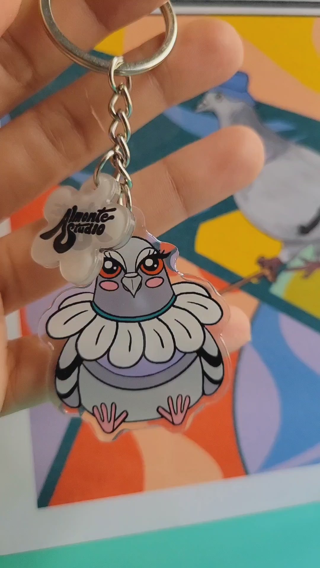 Featuring the Daisy Pigeon keychain, sticker and pin + the OG pigeon drawing, Kaleidoscope Pigeon in magnet form. (sculpture not included)